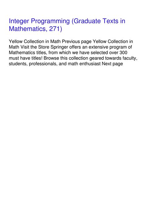 Read Online integer programming graduate texts in mathematics Reader online is a convenient and frugal way to read integer programming graduate texts in mathematics you love right from the comfort of your own home. Yes, there sites where you can get Reader "for free" but the ones listed below are clean from viruses and completely legal to use.